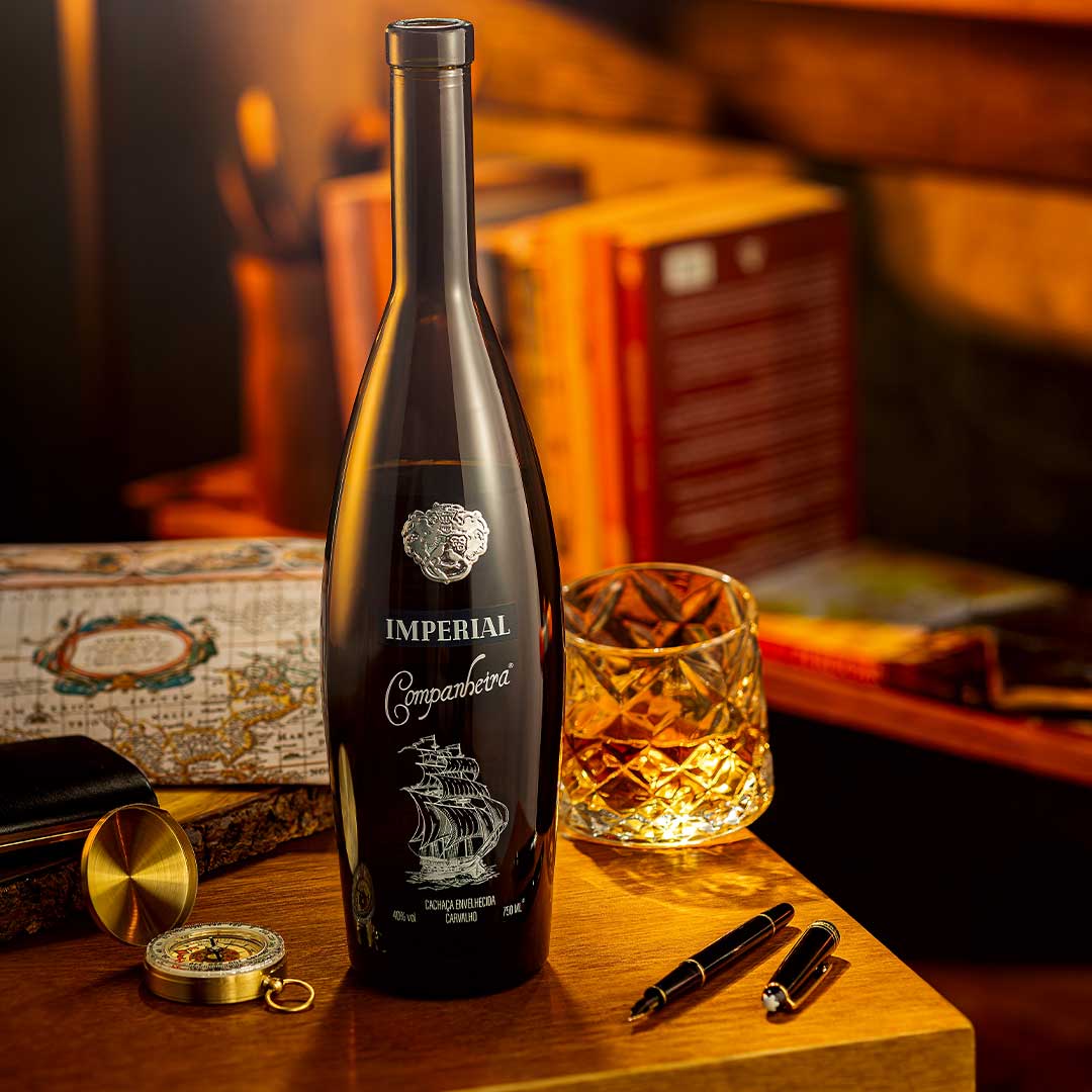 Descubra a Cachaça Companheira Imperial: uma bebida sofisticada com 9 anos de envelhecimento em barris de carvalho e vinho do Porto.